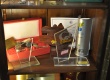 Armário da sala de entrada da reitoria da PUC-Rio com placas e esculturas recebidas de instituições de ensino superior e de empresas. |
