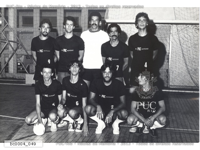 Time de futebol de salão uniformizado com camisetas PUC Notícias. |