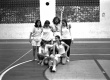 Alunas posam após jogo de futebol de salão. Na parede ao fundo, um cartaz de show do Di Castro. |