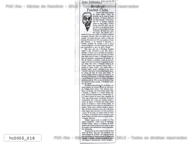 Crônica de João Saldanha no Jornal do Brasil sobre o Botaofogo Futebol Clube, onde cita o pe. Ormindo Sodré Viveiros de Castro, S.J. que, segundo o autor, era o melhor jogador do time. |