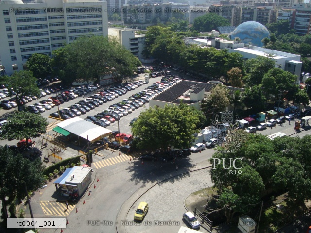 Imagem a partir do alto para o estacionamento principal. Vê-se o edifício do TecGraf, o Instituto Gênesis e o Planetário da Gávea. |
