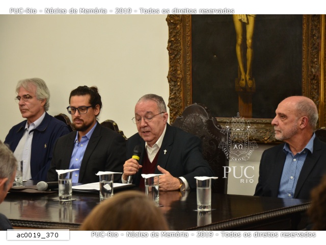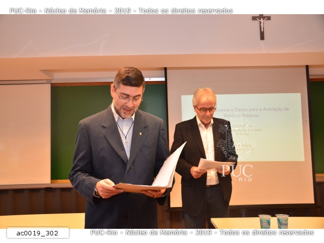 O Vice-Reitor da PUC-Rio pe. Álvaro Pimentel S.J e o Vice-Reitor para Assuntos Acadêmicos, José Ricardo Bergman, na Aula Magistral para sua titulação como Professor Titular da PUC-Rio, sobre o Uso de Economia e Dados para a Avaliação de Políticas Públicas. |