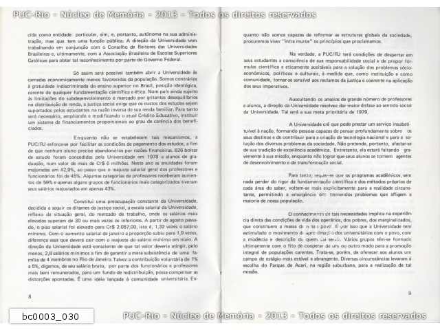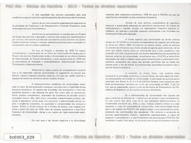 O Relatório apresenta o balanço das atividades acadêmicas da PUC-Rio do ano de 1978. A publicação contém informações do corpo docente e discente, da Associação dos Docentes (ADPUC) e da Associação de Funcionários (AFPUC), do projeto de reformulação da Regulamentação da Carreira Docente e dos convênios estabelecidos com a FUNARTE, FINEP, BNDE, MEC, IPHAN, entre outros. Destaca os projetos, os eventos, as palestras e os seminários realizados em 1978 e traz também dados sobre a situação financeira da Universidade e das bolsas de estudos. O Relatório foi apresentado pelo reitor pe. João Mac Dowell S.J. na abertura do ano acadêmico em 09 de março de 1979. |