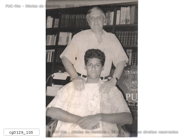 O jornalista Flávio Pinheiro posa com o filho Gabriel Pinheiro, aluno do curso de Jornalismo da PUC-Rio, para matéria no Jornal da PUC sobre a vocação jornalística em família. |