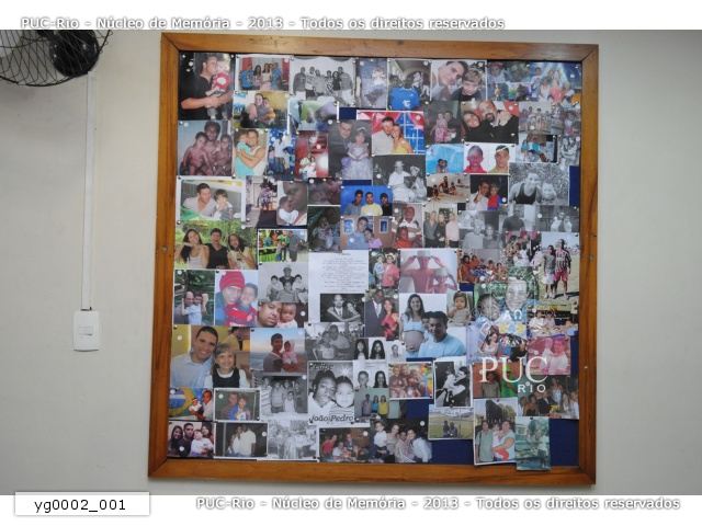Quadro de avisos com fotos de pais e filhos de funcionários da PUC-Rio. |
