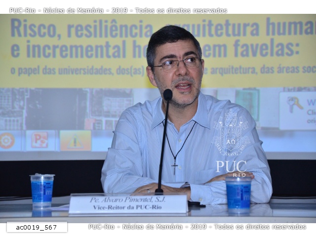 O padre Álvaro Pimentel S.J., Vice-Reitor da PUC-Rio, em palestra no seminário Risco, resiliência, arquitetura humanitária e incremental housing em favelas: o papel das universidades, dos(as) profissionais de arquitetura, das áreas sociais e das Marias & Marielles. |