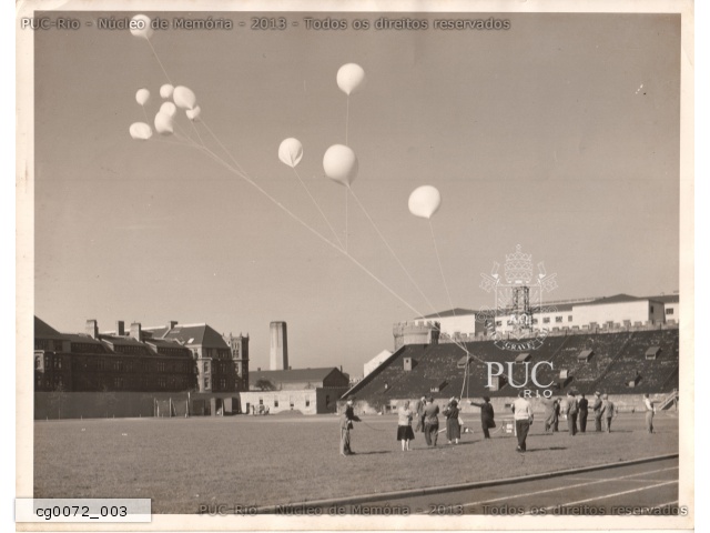 Pe. Roser no campo de football da Universidade de Chicago, utilizando balões atmosféricos para testes de raios cósmicos. |