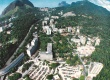 Imagem aérea da PUC-Rio, tendo ao fundo a Pedra da Gávea e o Morro Dois Irmãos. |