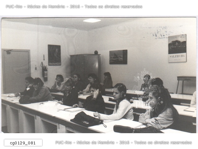 Alunos em aula de língua com a utilização de equipamento de áudio e fones de ouvido. |