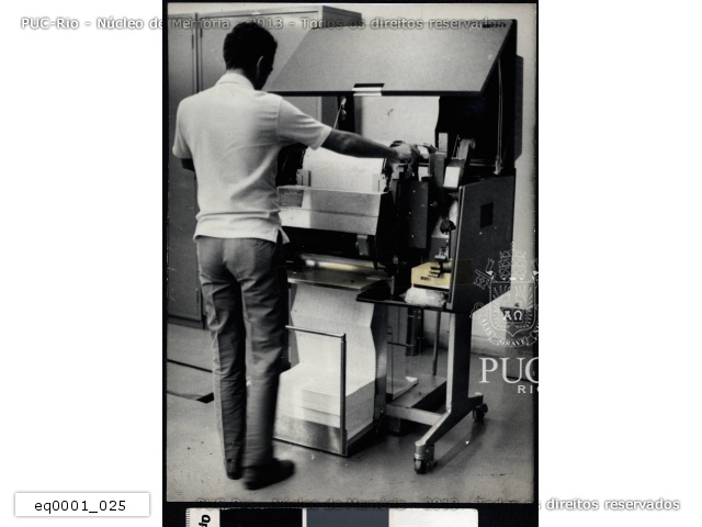 Impressora de formulário contínuo em operação. Este equipamento esteve em funcionamento na PUC-Rio até o final da década de 1980. |