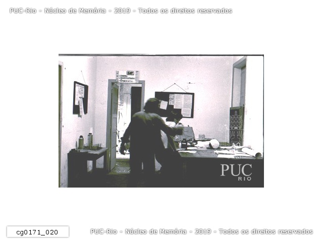 Pessoas na sala da sede do CUF. Cartazes na parede. |