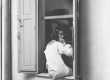 Pessoas na sede do CUF. Aluna sentada na janela. |