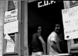 Pessoas na janela da sede do CUF. Cartazes com anúncios de atividades do CUF. |