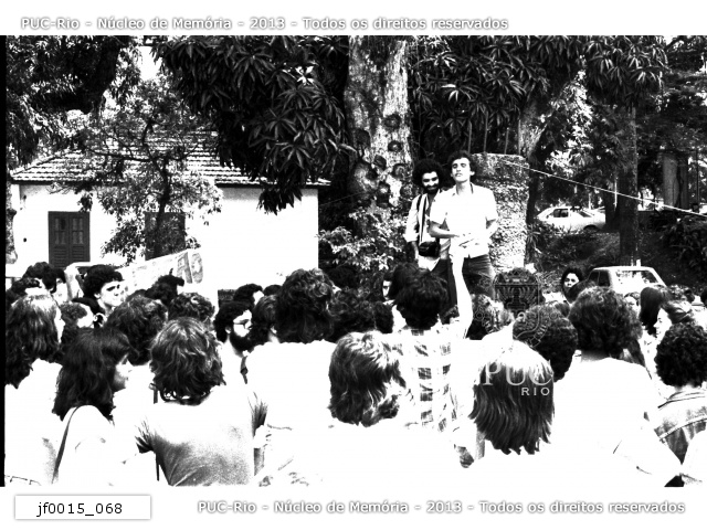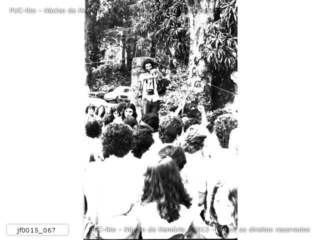 O reitor pe. Laércio Dias de Moura S.J. ao microfone nas comemorações do Jubileu de Prata da PUC-Rio. Na ocasião, com a presença do Embaixador da Alemanha Ocidental, foi inaugurado o prédio da Biblioteca Central e as novas instalações da Reitoria, ainda em obras, e houve a entrega das medalhas Cardeal Leme aos professores e o descerramento das placas aos benfeitores. |