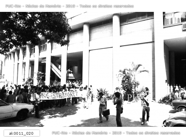 Alunos reunidos na frente do portão de entrada da PUC-Rio, na tentativa de permitir a entrada de Miguel Arraes e do restante dos estudantes. |