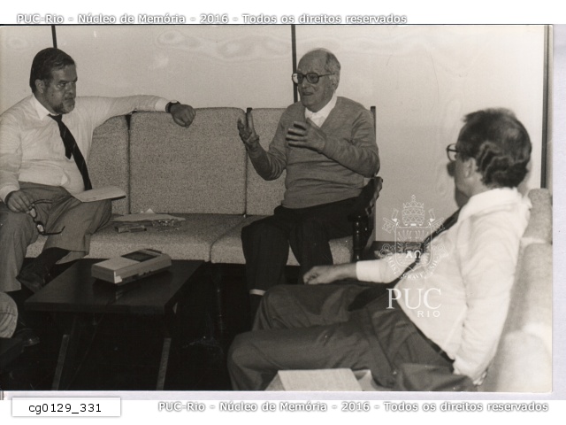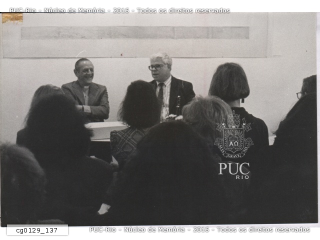 O Reitor da PUC-Rio, Pe. Laércio Dias de Moura S.J. ao lado de Sérgio Paulo Rouanet, Secretário Nacional de Cultura, em palestra sobre a Política Nacional de Cultura. O evento encerrava oficialmente a exposição A Morada Carioca, parte da programação da conferência Rio 92. |
