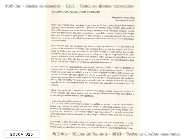Texto da professora Margarida de Souza Neves do Departamento de História sobre os desafios da interdisciplinalidade dentro de uma Universidade e a sua aplicação. Fala também do início do programa de pós-graduação em História Social da Cultura do Departamento de História. |