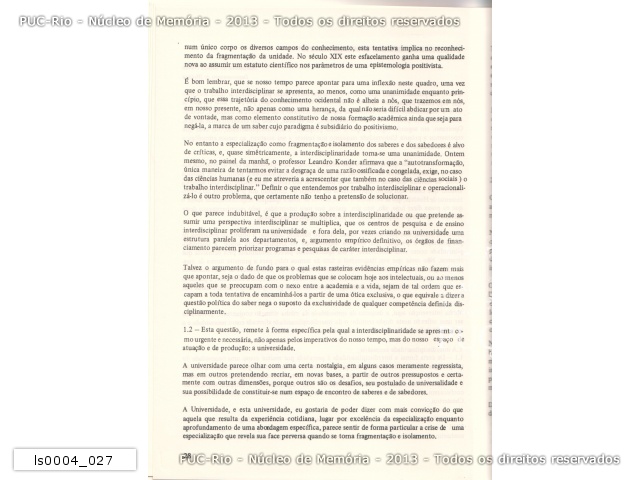 Continuação do texto da professora Margarida de Souza Neves do Departamento de História sobre os desafios da interdisciplinalidade dentro de uma Universidade e a sua aplicação. Fala também do início do programa de pós-graduação em História Social da Cultura do Departamento de História. |