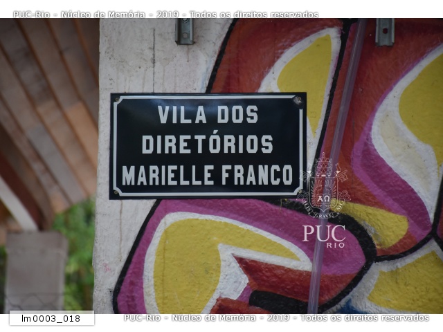 Placa Vila dos Diretórios Marielle Franco instalada na casa 11 da Vila dos Diretórios da PUC-Rio. |