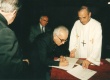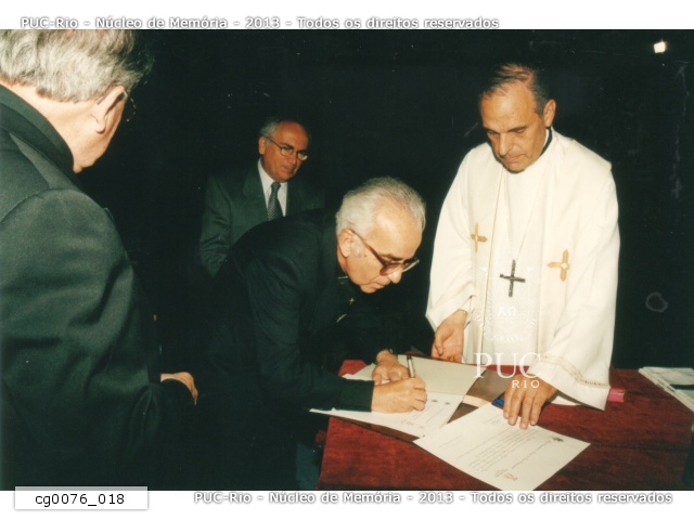 O pe. Pedro Magalhães Guimarães Ferreira S.J. assina o termo de lançamento da Pedra Fundamental da Igreja do Sagrado Coração de Jesus da PUC-Rio. |