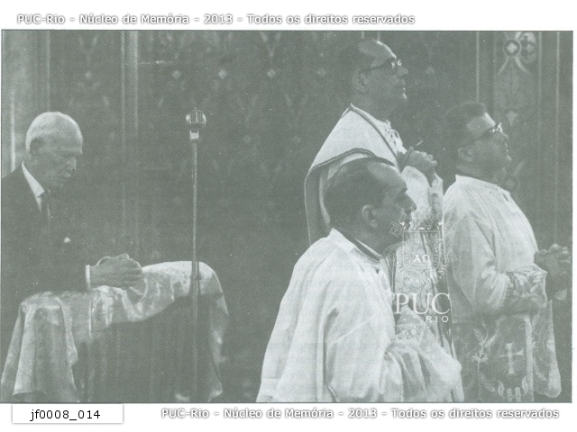 Padre Ávila, ao centro, na missa de bodas de ouro de seus pais. À sua direita está Dom Helder Camara e ao lado esquerdo seu pai, Dr. José Bastos de Ávila. Fotografia publicada na Revista PUC Ciência nº 7, 1995, p.7. |