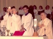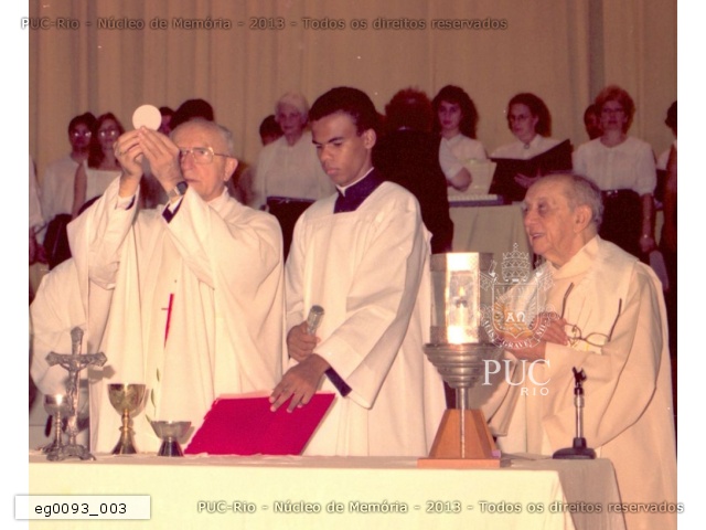 Dom Eugênio Sales e dom Helder Camara celebram a Missa de Ação de Graças em homenagem aos 50 anos da PUC-Rio. Ao fundo, o Coral da PUC-Rio. |