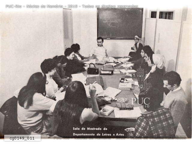 O prof. Affonso Romano de Sant'Anna em aula com alunos na Sala de Mestrado do, à época, Departamento de Letras e Artes. |