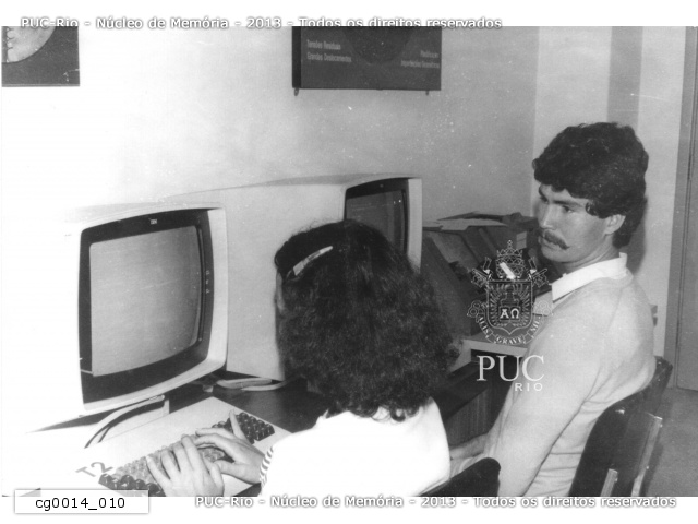 Pessoas utilizam terminais do computador IBM em sala do Departamento de Engenharia Civil. |