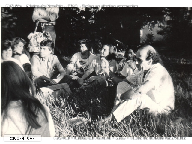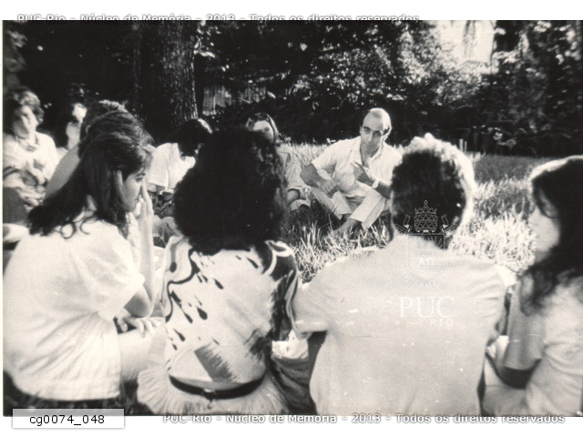 Prof. Affonso Romano de Sant´Anna (LET) com alunos em aula nos gramados. |