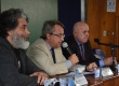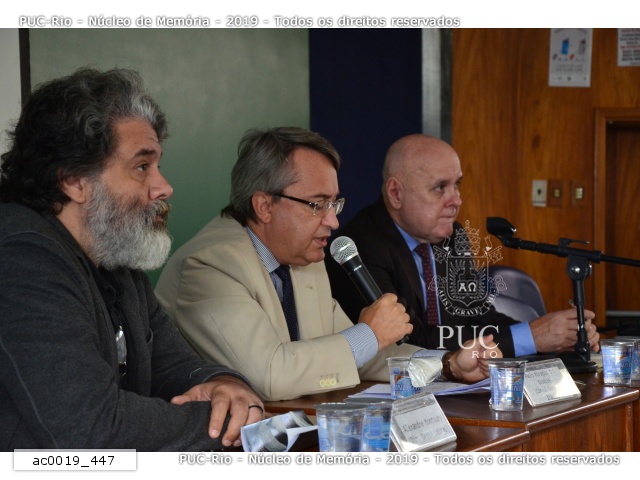 Alexandre Mountary Baptista Coutinho, diretor do Departamento de Letras; Paolo Miraglia Del Giudice, Cônsul-geral da Itália e o professor Renato Lessa, do Departamento de Direito, na abertura do colóquio sobre Centenário do escritor italiano Primo Levi.