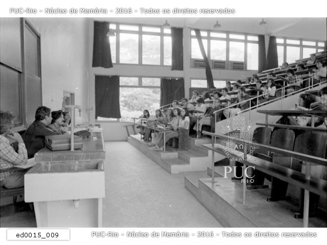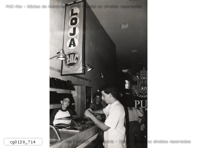 Alunos observam os produtos da Loja PUC que vendia camisas, lápis, cadernos e outros itens com a marca institucional da PUC-Rio. |