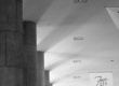 Teto com reflexos e sombras, pilotis e banners comemorativos dos 70 anos da PUC-Rio. |
