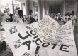Integrantes do Comando de Luta - que tinha o apoio da Associação de Alunos da PUC - exibem cartaz pedindo por boicote aos pagamentos das mensalidades. O protesto teria ocorrido com a pretensão de acabar com os aumentos indiscriminados. |