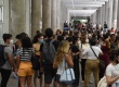 Alunos se reencontram nos pilotis da Ala Leme. |