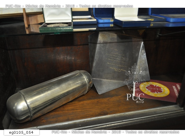 Medalhas, diplomas, memorabílias e troféu do armário da sala de entrada da reitoria recebidos de instituições de ensino superior e empresas ou confeccionados pela PUC-Rio. |