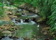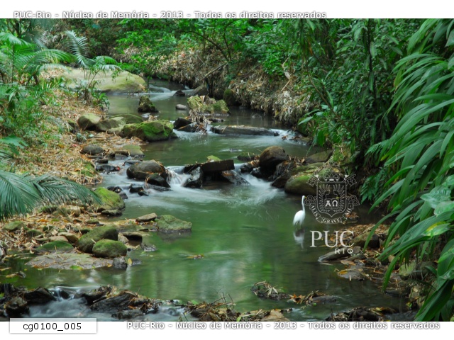 Foto do Rio Rainha, rio que corta o campus da PUC-Rio. Na imagem é possível visualizar a vegetação do riacho e uma garça ao centro. |