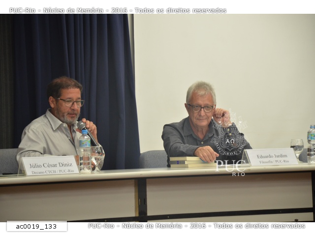 O membro decano do CTCH Júlio César Diniz e o professor do Departamento de Filosofia Eduardo Jardim no lançamento do livro Correspondência Mário de Andrade & Alceu Amoroso Lima, promovido pela Editora PUC-Rio e pelo Decanato do CTCH. |