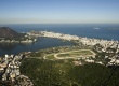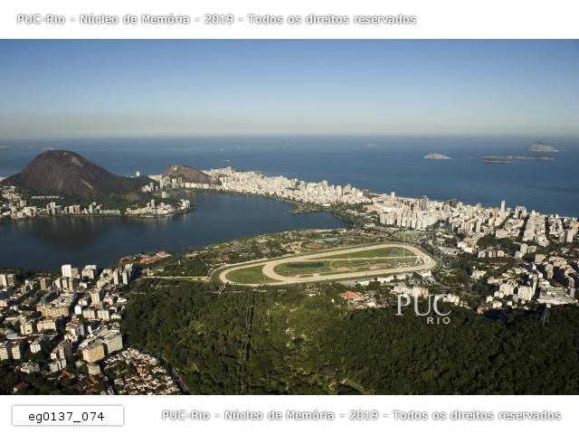 Vista aérea do Jockey Club Brasileiro, Jardim Botânico, Lagoa Rodrigo de Freitas e parte do bairro da Gávea. Ao fundo, o mar de Ipanema e Leblon. No lado direito, embaixo, a Igreja de Nossa Senhora de Conceição da Gávea. |