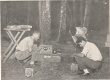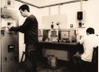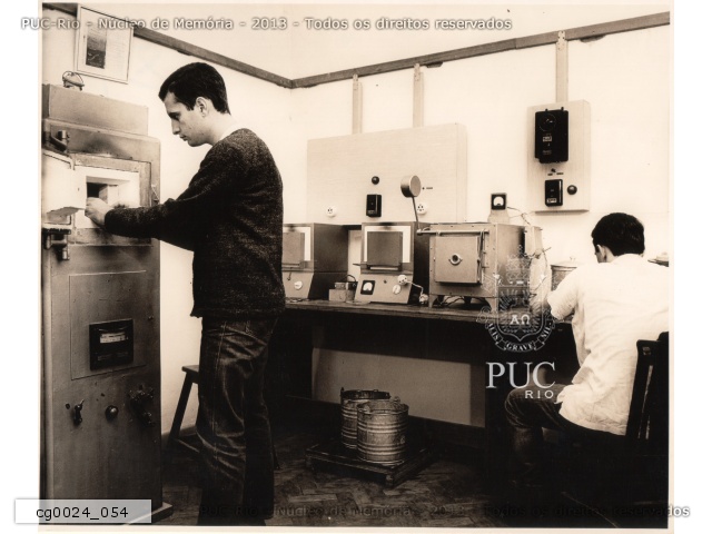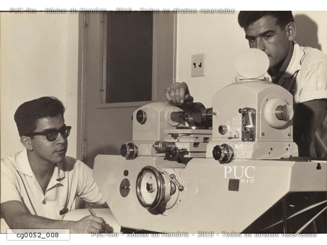 O prof. pe. Thomas Cullen S.J. e o funcionário Sérgio Martins Xavier no Laboratório de Física do Estado Sólido localizado no subsolo do Edifício Padre Francisco Xavier Röser, na Ala Leme. |