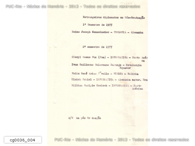 Relação com nome de seis alunos estrangeiros diplomados nos programas de Pós-Graduação da PUC-Rio em 1977. |