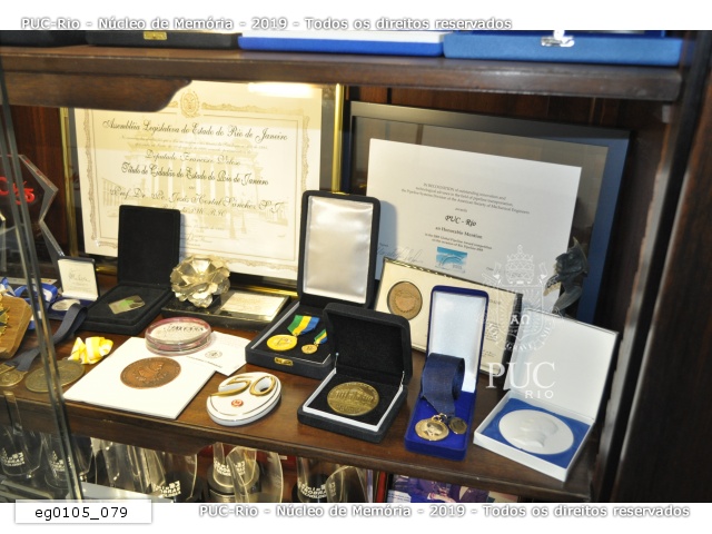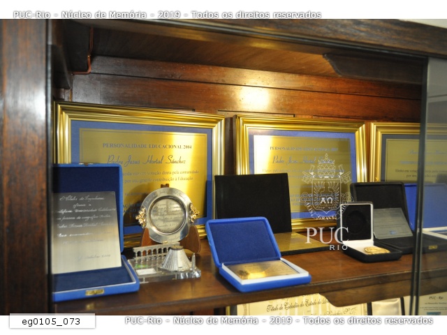 Armário da sala de entrada da reitoria da PUC-Rio com placas, medalhas e prêmios recebidos de instituições de ensino superior e empresas, e o diploma com o título de cidadão honorário do estado do Rio de Janeiro concedido ao pe. Jesús Hortal Sànchez, S.J.. |