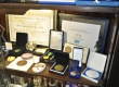Armário da sala de entrada da reitoria da PUC-Rio com medalhas, placas, esculturas, diplomas, memorabílias e prêmios recebidos de instituições de ensino superior e empresas. |
