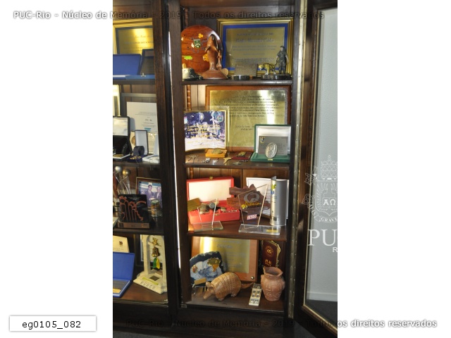 Armário da sala de entrada da reitoria com medalhas, esculturas e diplomas recebidos de instituições de ensino superior e empresas, a placa recebida pelo pe. Jesús Hortal Sànchez, S.J., pelos 40 anos da Pós-Graduação do Centro Técnico Científico e a moção de congratulação recebida pela PUC-Rio da Assembleia Legislativa do Estado do Rio de Janeiro. |