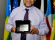 Professor Manuel Diegues Júnior recebe uma placa comemorativa. A fotografia em questão ilustrou uma nota sobre seu falecimento no Jornal da PUC. |