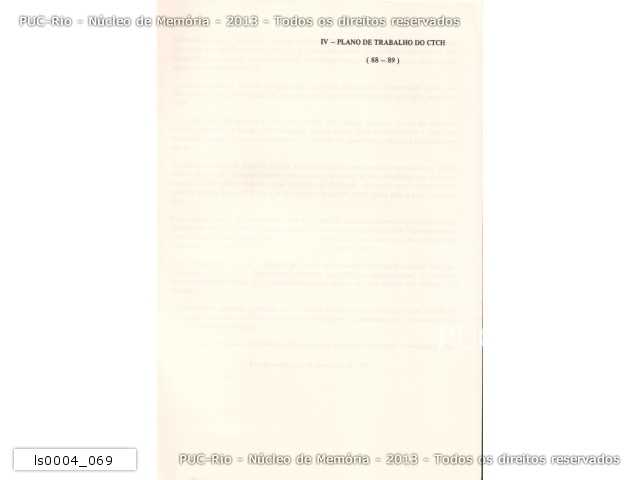 Folha de rosto do plano de trabalho do CTCH para os anos de 1988 e 1989. |