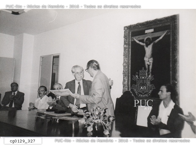 Reitor pe. Laércio Dias de Moura S.J. entrega ao professor Lindolpho de Carvalho Dias a Medalha do Mérito Cardeal Dom Sebastião Leme. |