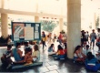 Alunos sentados no chão, em roupas de verão. |