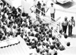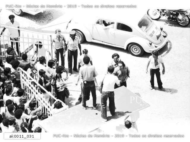 Alunos reunidos na frente do portão de entrada da PUC-Rio, na tentativa de permitir a entrada de Miguel Arraes (na foto, do lado direito já dentro da Universidade) e do restante dos estudantes. |