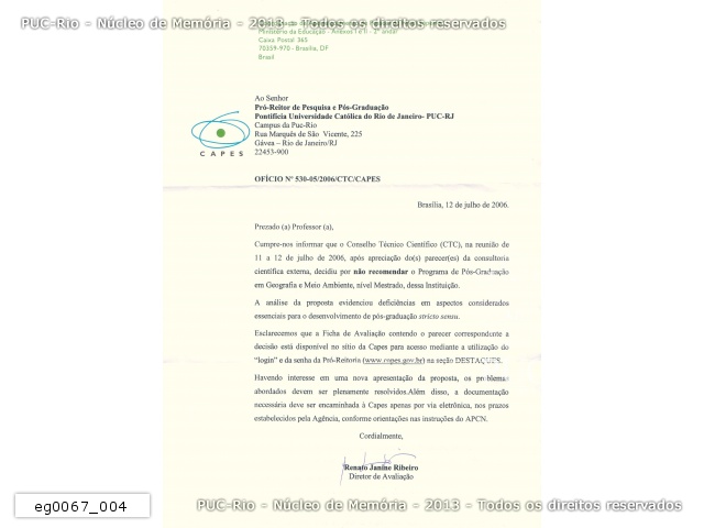 Ofício do Diretor de Avaliação da Capes, prof. Renato Janine Ribeiro, não recomendando a criação do mestrado em Geografia e Meio Ambiente. |