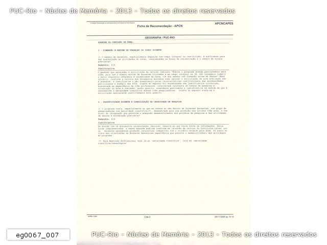 Ofício do diretor de avaliação da Capes, prof. Renato Janine Ribeiro, endereçado ao prof. Bergmann, Coordenador Central de Pós-graduação da PUC-Rio, autorizando com condicionantes o funcionamento Mestrado em Geografia. |